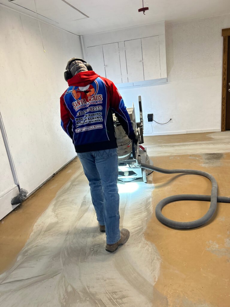 Embarking on the journey of concrete coating begins with meticulous preparation—a crucial first step in laying a solid foundation for the process. At Santa Claus Exterior Cleaning, we understand the importance of thorough preparation, which is why we prioritize this phase to ensure optimal results for our clients. Step 1: Precision PreparationOur process begins with precision and attention to detail. We start by prepping your area through diamond grinding the surface of your floor. This technique is essential for creating a scratch pattern that facilitates superior adhesion of the coating, guaranteeing its longevity and durability. During this process, we use specialized vacuums attached to each grinder to minimize dust. By effectively capturing dust particles, we maintain a clean and controlled environment, ensuring both the safety of our team and the preservation of your property. Why We PreparePreparation lays the groundwork for success in concrete coating, and we spare no effort in ensuring every aspect is meticulously addressed. By prioritizing precision and employing advanced techniques, we set the stage for a flawless application, delivering results that exceed expectations. Stay tuned as we delve deeper into the subsequent steps of our concrete coating process, each contributing to transforming your concrete surfaces into durable, aesthetically pleasing assets. With Santa Claus Exterior Cleaning, your journey to enhanced durability and beauty begins with meticulous preparation